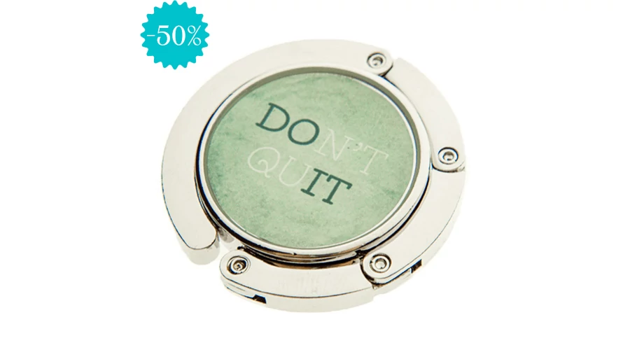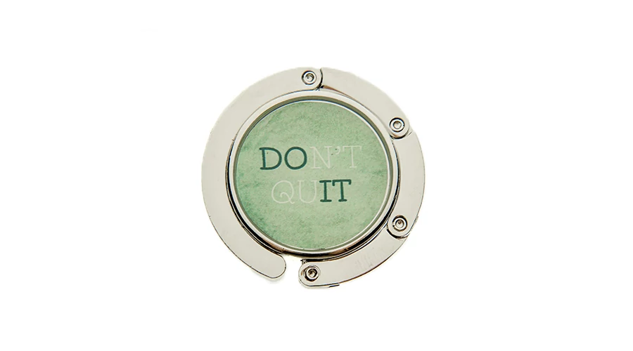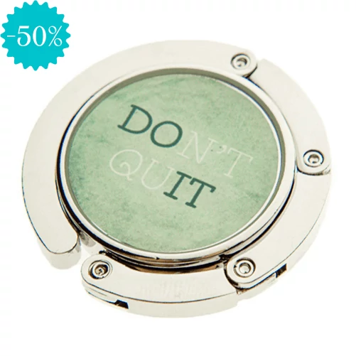 Összehajtható szárú, mágneses táskatartó ékszer "DON'T QUIT" felirattal. Talpán csúszásmentes gumikorong.